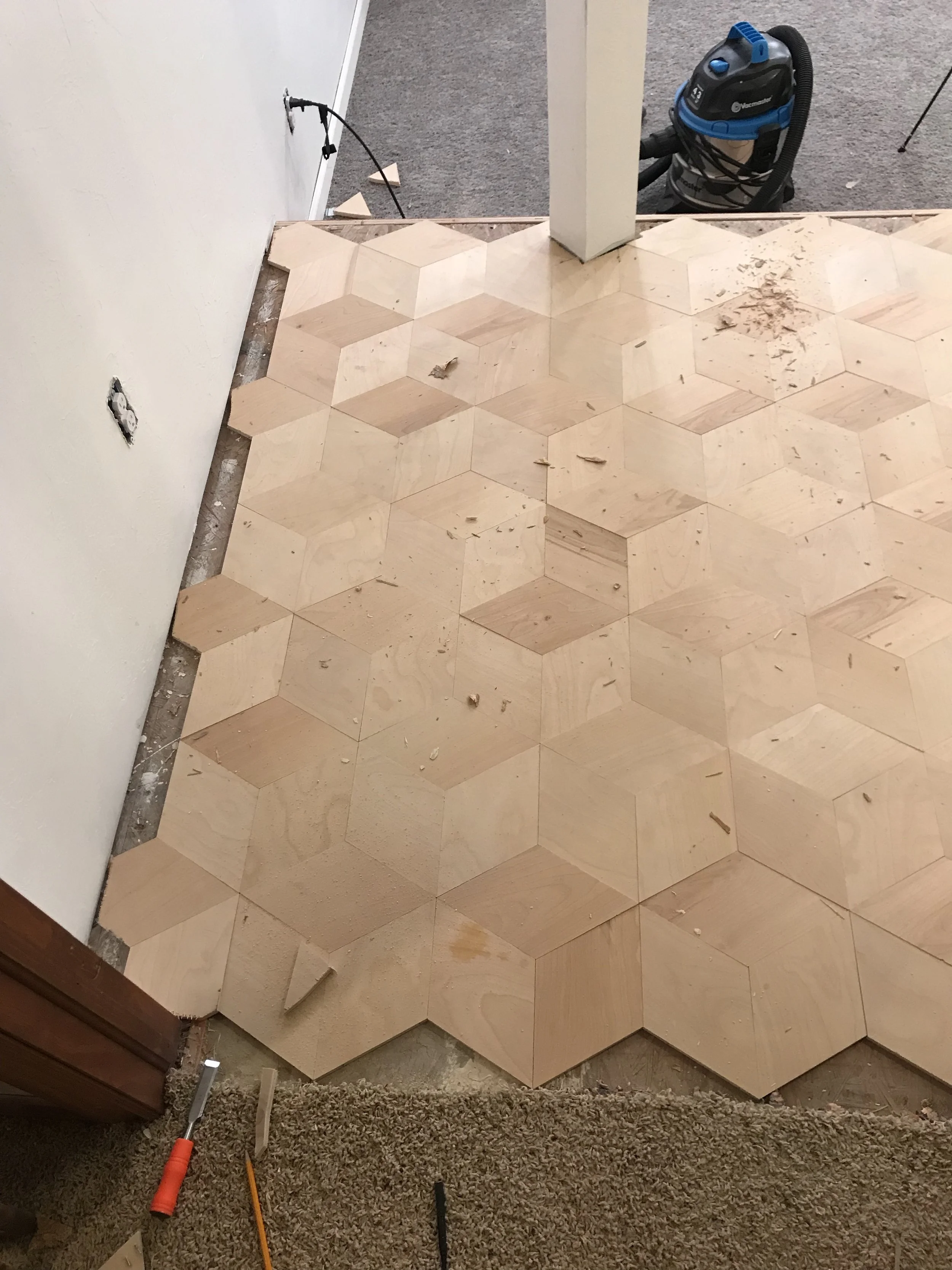 In the youtube video you’ll see me lay out chalk lines every 12” for reference, It’s not totally necessary, but it was reassuring seeing the floors were being installed straight. I used my 16 gauge brad nailer to “toe nail” each piece into the OSB subfloor. If you’re installing this on a concrete floor, you’ll need to use an adhesive (or install a subfloor). Before installing any piece if would fully assemble each hexagon to endure it was going well. Occasionally, I had a piece that would need to be trimmed a tiny bit for a good fit so I kept my table saw set at the proper angle