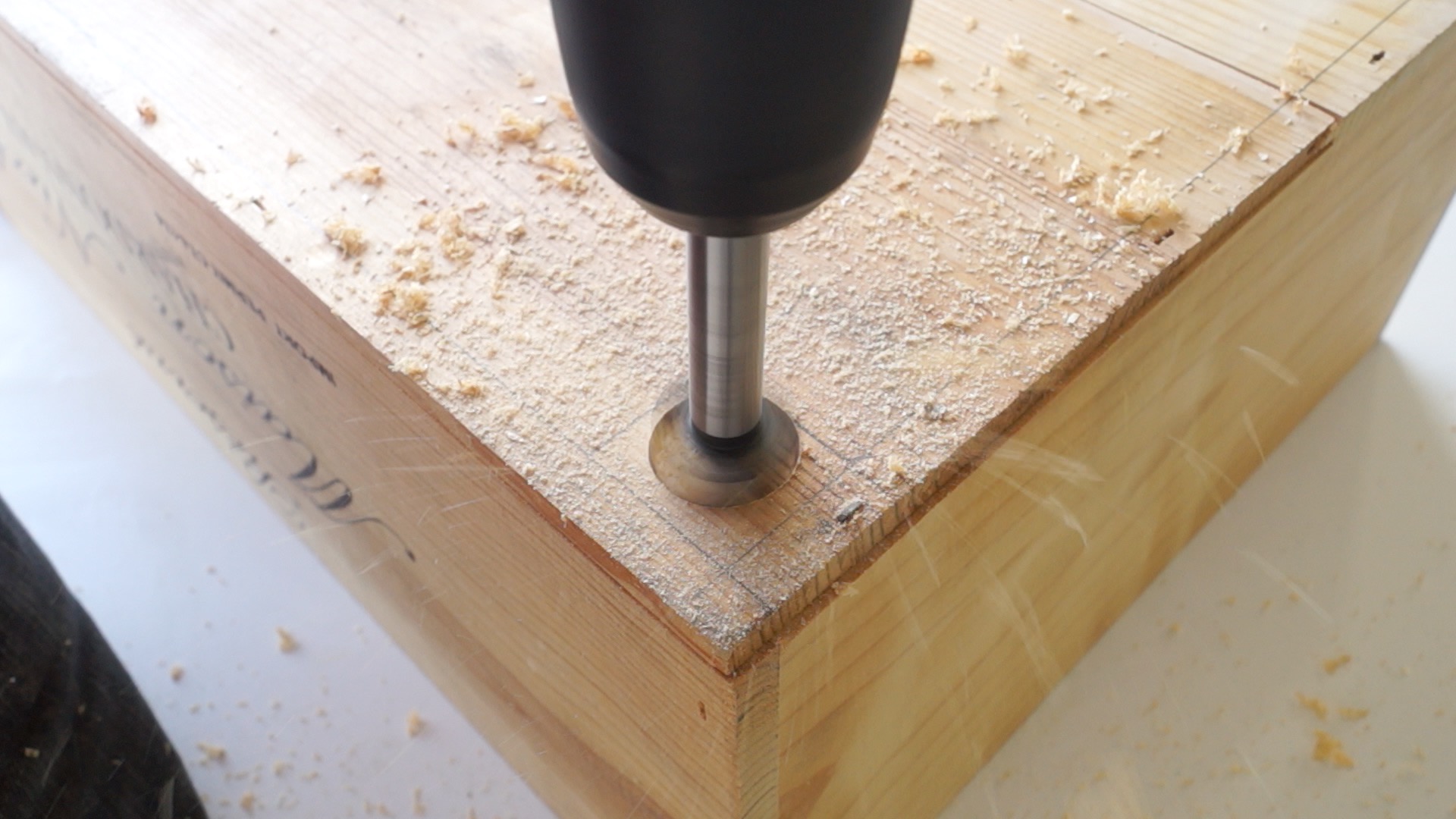 Next, I traced the outline of the legs on the bottom of the box, used a 1" forstner bit to make a whole to get my jigsaw into and make a cutout for the legs.