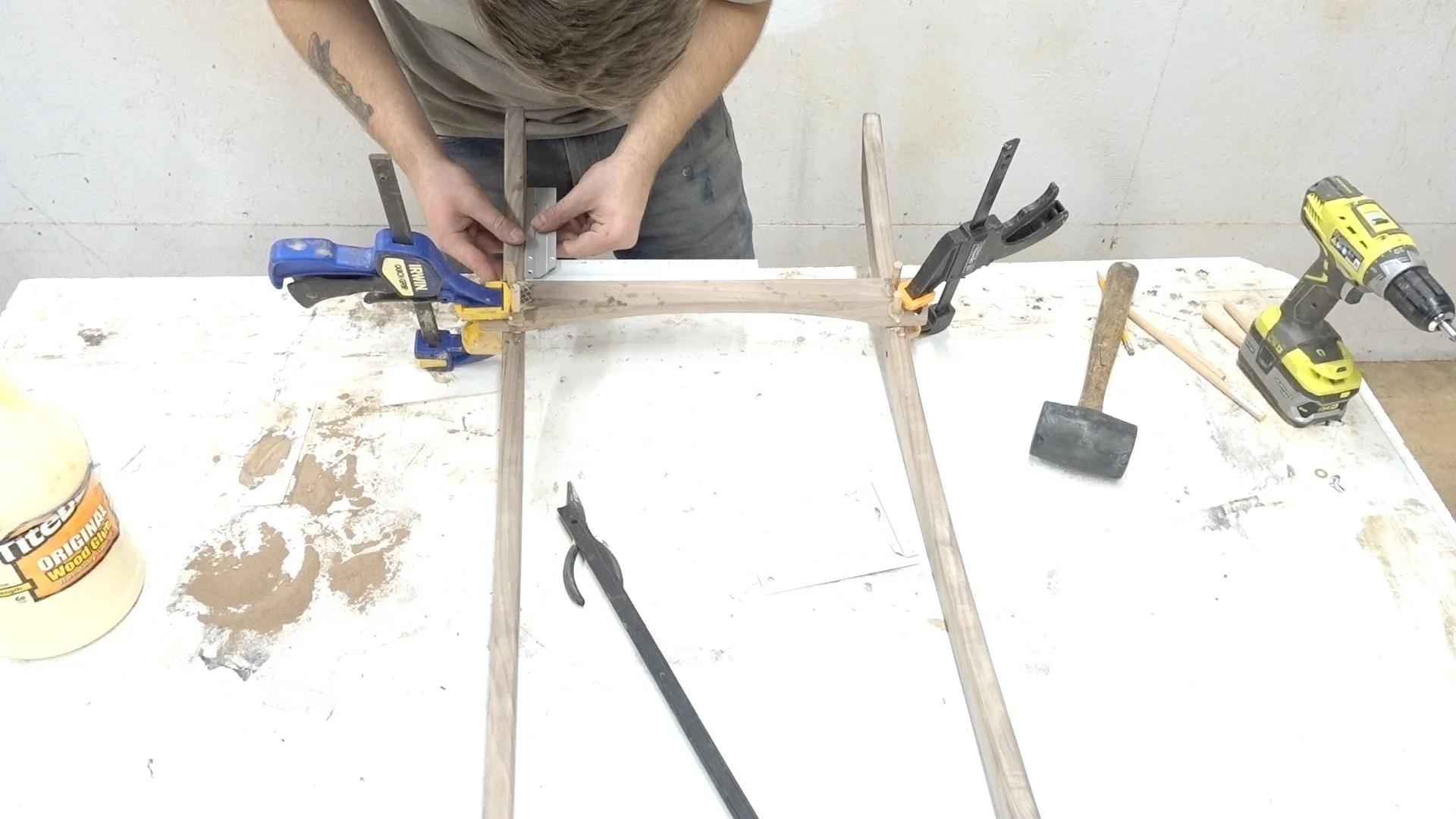 After I cut the angle on the horizontal brace, I pinned it to the slats using 1/4" dowels. Refer to the video on the clamping set up. Making sure everything is square here ensures everything else will be. (for the most part).
